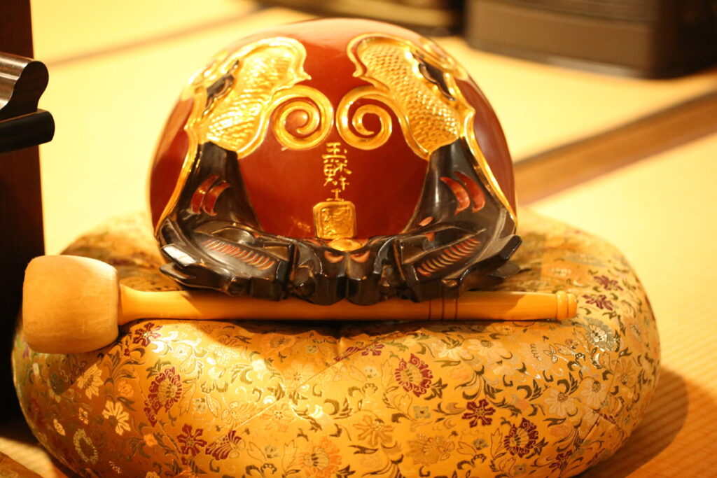 木魚の音は、憶念(おくねん)を助け、瞑想や読経中の集中力を高める効果があります。一定のリズムで木魚を叩くことで、心を落ち着け、内面の平穏へと導くことができるのです。